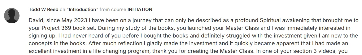 TERMS AND CONDITIONS - I am here to inspire my own personal transformation. I take personal responsibility for my well-being and with respect for myself I gratefully accept control of my choices. I hereby release, waive, and discharge any claims against, Project 369, David Kasneci, and/or any of their associates or affiliates. I take full responsibility and am responsible for all liability for loss or injury incurred while in association with or applying information learned from David Kasneci and/or any of their associates or affiliates. Nothing David Kasneci shares is intended to be, nor should be construed as professional advice in the areas of medicine, psychology, or psychiatry. Individuals with such conditions are advised to consult licensed professionals.